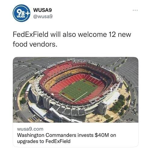🏟️ The Washington Commanders anunciaron planes para invertir 40 millones de dólares en FedExField. La lista de cambios incluye tres nuevas suites temáticas, nuevos pedestales para escaneo de boletos, mejoras en los puntos de venta e imágenes actualizadas de la marca Commanders alrededor del estadio, así como reparaciones de mantenimiento en el tazón y pintura alrededor del estadio. FedExField también dará la bienvenida a 12 nuevos stands de vendedores de comida.