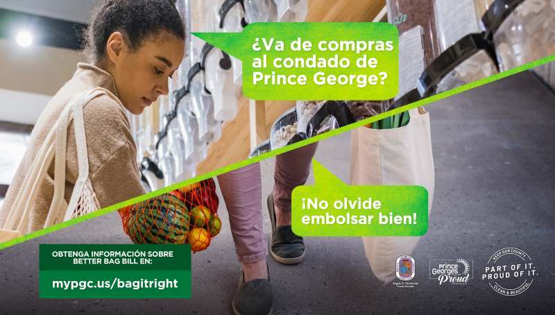 ¿Ya se enteró? El condado de Prince George está abandonará las bolsas de plástico. A partir del 1 de enero de 2024, el condado de Prince George prohíbe a todos los establecimientos minoristas dar bolsas plásticas a los compradores. Los compradores pueden pagar 10 centavos por bolsas de papel para llevar, comprar o llevar bolsas reutilizables.